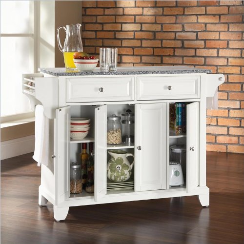 Finish:White Constructed of solid hardwood and wood veneers, this kitchen island is designed for longevity. The beautiful raised panel doors and drawer fronts provide the ultimate in style to dress up your kitchen. Style, function and quality make this kitchen island a wise addition to your home. Two deep drawers are great for anything from utensils to storage containers Behind the four doors, you will find threeadjustable shelves and an abundance of storage space for things that you prefer to be out of sight Comes with a Solid Grante Top Hand rubbed; Mulit-Step finish Includes a spice rack with towel bar